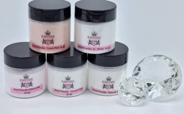 Criystal Clear acrylic powder. Heeft een speciale samenstelling van 24 korrels die ervoor zorgen dat de poeder in combinatie met de Empire Liquid perfect samenwerken. Zodat ieder nagelstyliste de perfecte nagel kan maken. De poeders zijn verkrijgbaar in div. kleuren.